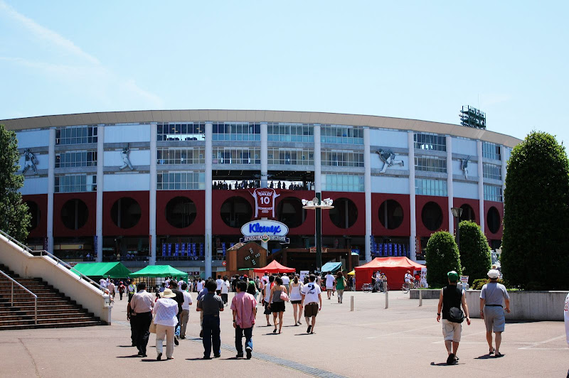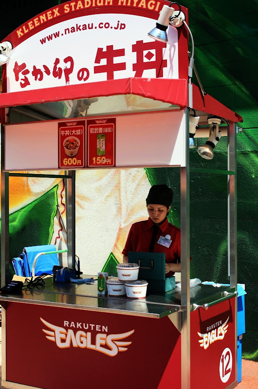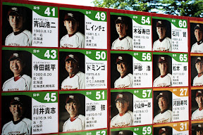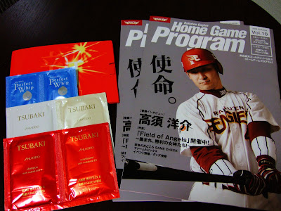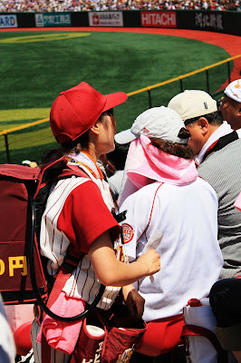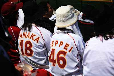 另外,觀察球員人氣最直接的方式就是其專屬商品銷售,如球衣,岩隈久志、田中將大、鉄平等人無疑是比較紅的,有銘兼久人氣也不錯,坐在我前面的女球迷就是她的粉絲。