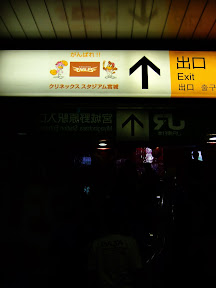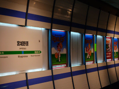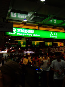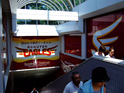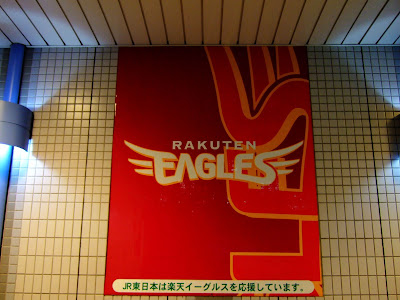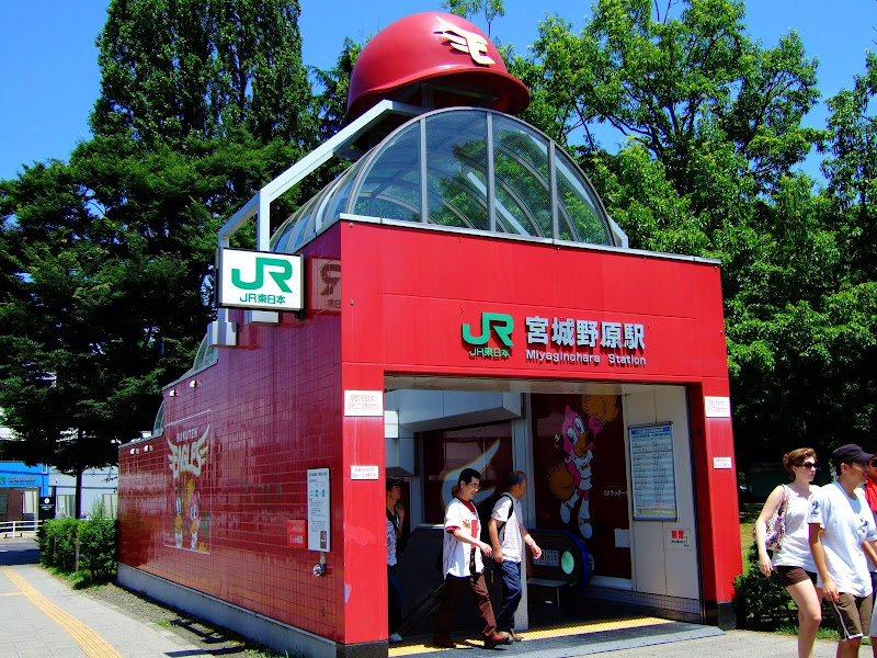 JR宮城野原站很有樂天味,月台站名旁就有整排樂天吉祥物圖案(JR東日本將其視為合作互利的大好商機),站內到處都有位樂天加油的圖案、旗幟,以及各式圖案;更厲害的是車站的出入口直接戴上一頂樂天的帽子,出入口也以樂天的主色(紅色)裝潢,可說是一到這個站就感受到球場的氣氛。