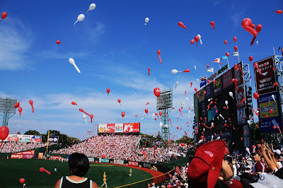 當然,不虧是在自己家裡,伴隨「樂天、樂天 Eagles」歌聲所施放紅、白兩氣球佈滿蔚藍天空,相當壯觀。掉落場中滿地氣球隨後由場中帶牛仔帽工作人員立刻撿拾完畢,讓球場迅速恢復原來樣貌,不會耽誤到接下來比賽的進行。