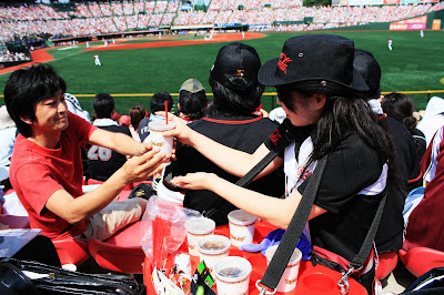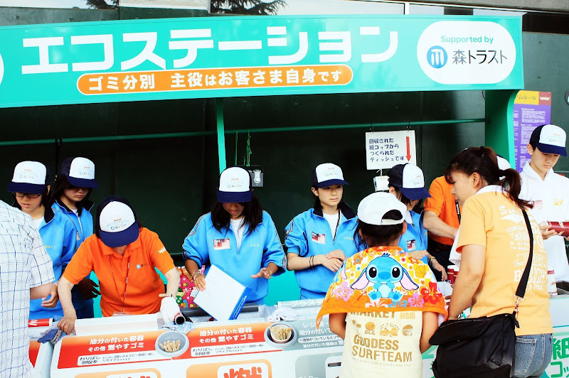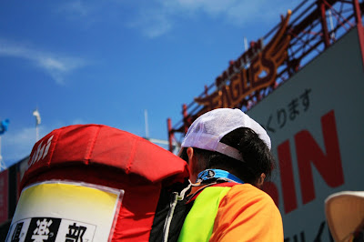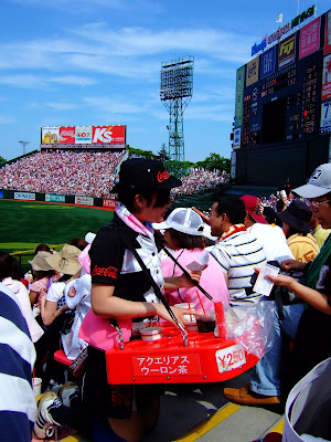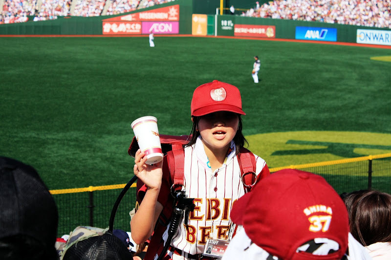 不過由於比賽在中午舉行,火辣的太陽也造就她們的業績,坐在我們左前方的日本人前後總共喝了五杯飲料,貢獻出3、4千塊日幣,原來商機要這樣創造。我們在途中也曾離開座位去買涼飲,因為太陽實在太大了,熱...。