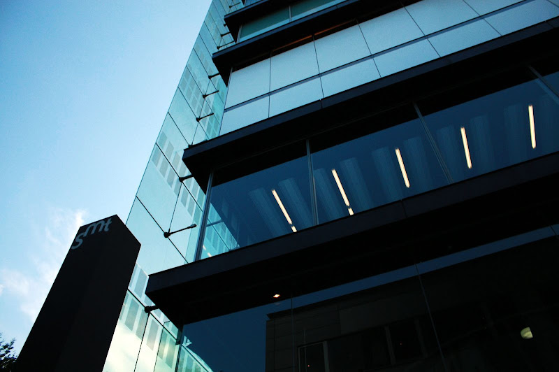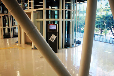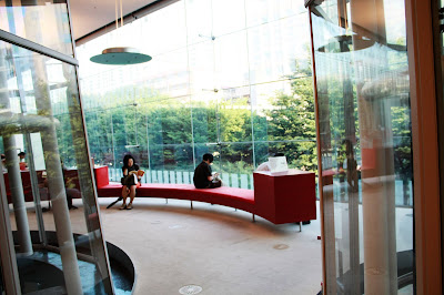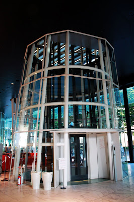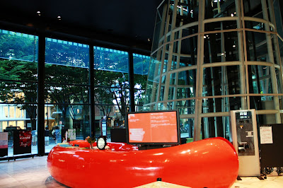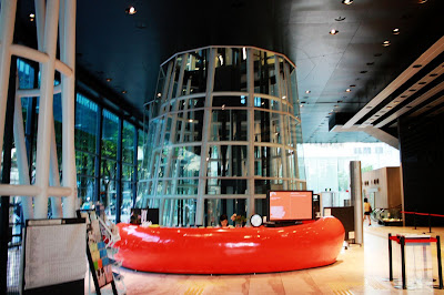 除了獨特的外觀,進到裡面也處處令人驚喜之處。一樓開放空間白色金屬圓柱包覆透明電梯,服務台則是鮮豔紅色,建築師在這裡大玩結構創意與色彩。