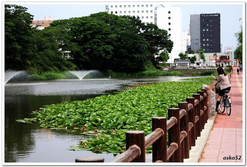 騎腳踏車路過的日本妹看到荷花,也拿起手機拍照,一種相當悠閒生活的感覺。