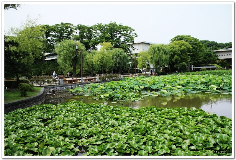 外圍池塘有盛開的荷花,