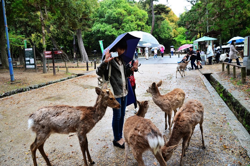 雨勢稍歇,沿著參道往回走,邊逗弄一下小鹿。