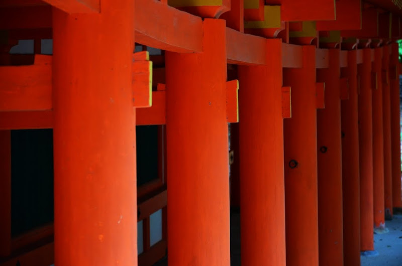 神社內漫長迴廊,橘色廊柱,以及一旁燈籠構成甚為壯觀的景物。